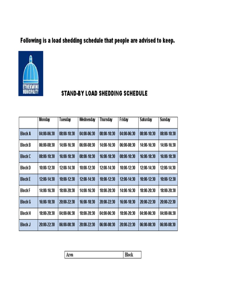 Load shedding schedule stage 2 is given here. Please note that load shedding will commence when the instruction to shed load is received from eskom. Buffelbosch a durban harbour d hambanathi f buffelsdale j durban north g harinagar a bulwer b. View load shedding schedules for your areas for the following month. Please search any specific suburb name below to view the monthly load shedding schedule.