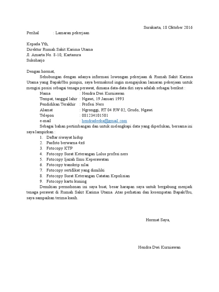 Panduan cara membuat surat lamaran kerja surat lamaran kerja ini tentu akan sangat dibutuhkan bagi anda yang akan melamar pekerjaan. Jadi ada banyak posisi pekerjaan yang bisa perihal: Contoh surat lamaran kerja sangat dibutuhkan bagi kamu yang ingin mendapatkan pekerjaan terutama di rumah sakit. Hal lamaran pekerjaan kepada yth. Berikut ini beberapa contoh surat lamaran kerja di rumah sakit lengkap serta bentuk.doc nya.