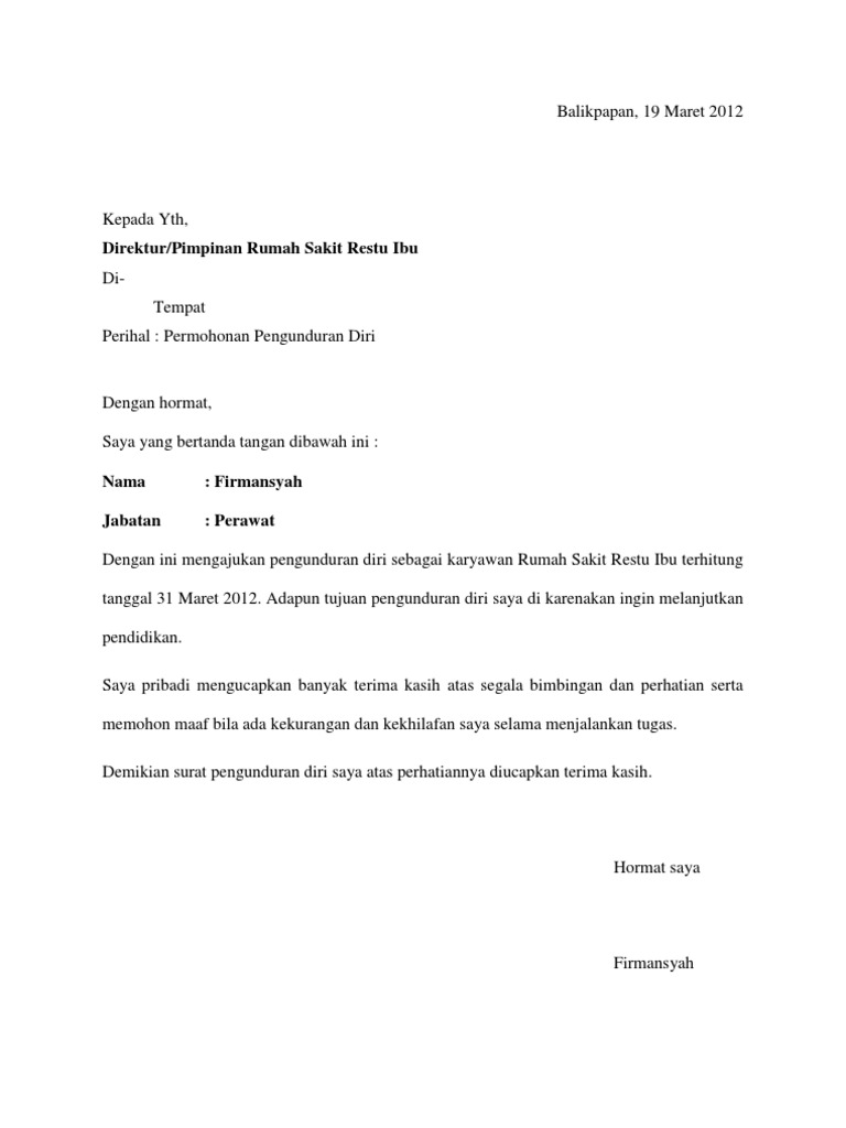 Apr 10, 2013 · home » contoh surat » contoh surat pengunduran diri | dari rumah sakit | yang baik dan benar tahun 2013.!! Siapa surat pengunduran dari rumah sakit? Aug 15, 2019 · contoh surat pengunduran diri perawat rumah sakit have a graphic from the other.contoh surat pengunduran diri perawat rumah sakit it also will include a picture of a sort that may be seen in the gallery of contoh surat pengunduran diri perawat rumah sakit. Keluar dari pekerjaan bisa karena banyak alasan, salah satunya karena sakit. Surat pengunduran diri perawat dan contoh email.